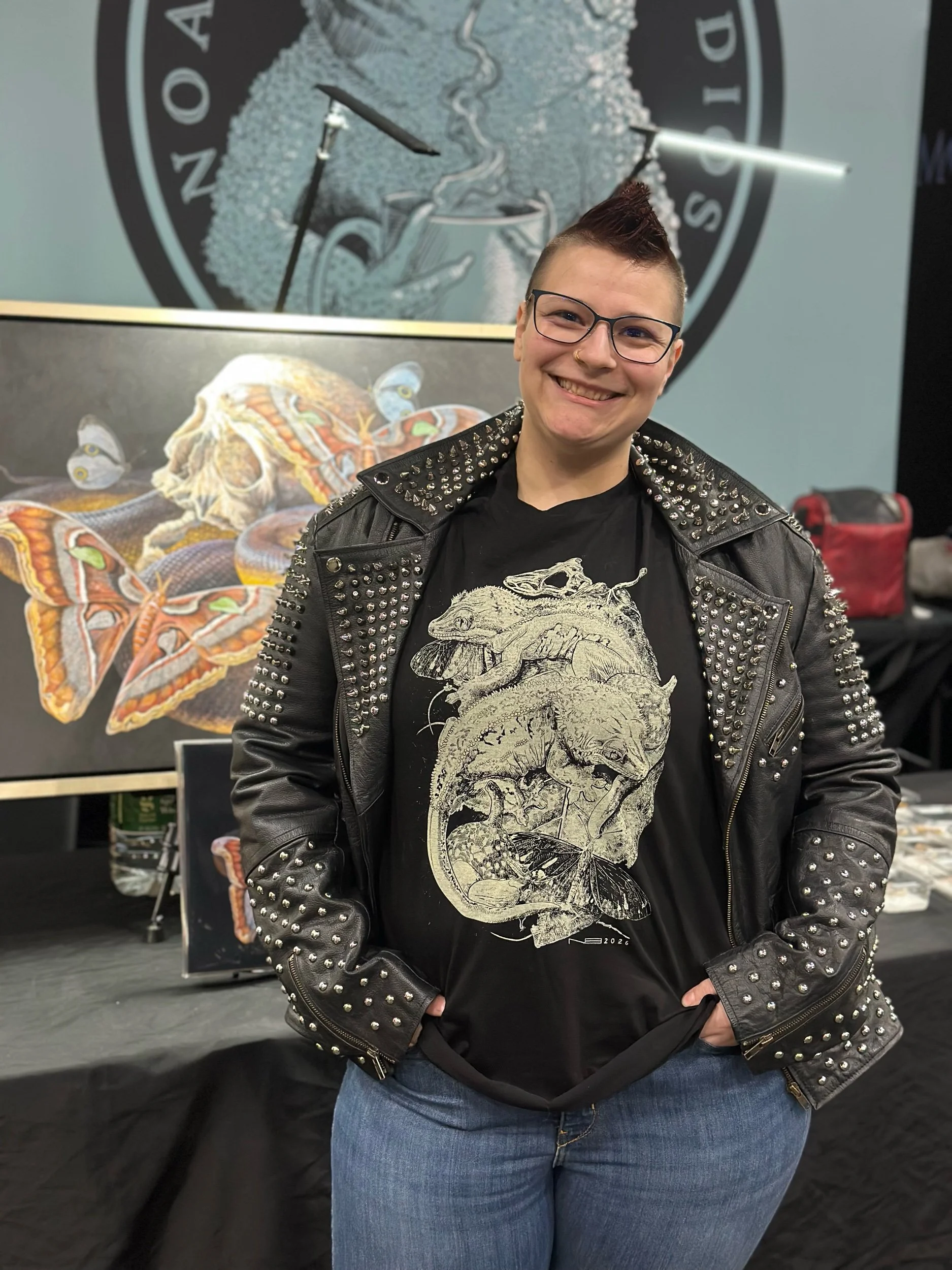 The composition highlights multiple stages and elements of the gecko’s form, incorporating both living subjects and skeletal reference to emphasize structure, growth, and biological detail. The balance between pattern, anatomy, and design creates a dynamic visual that showcases the species from both an artistic and naturalistic perspective.